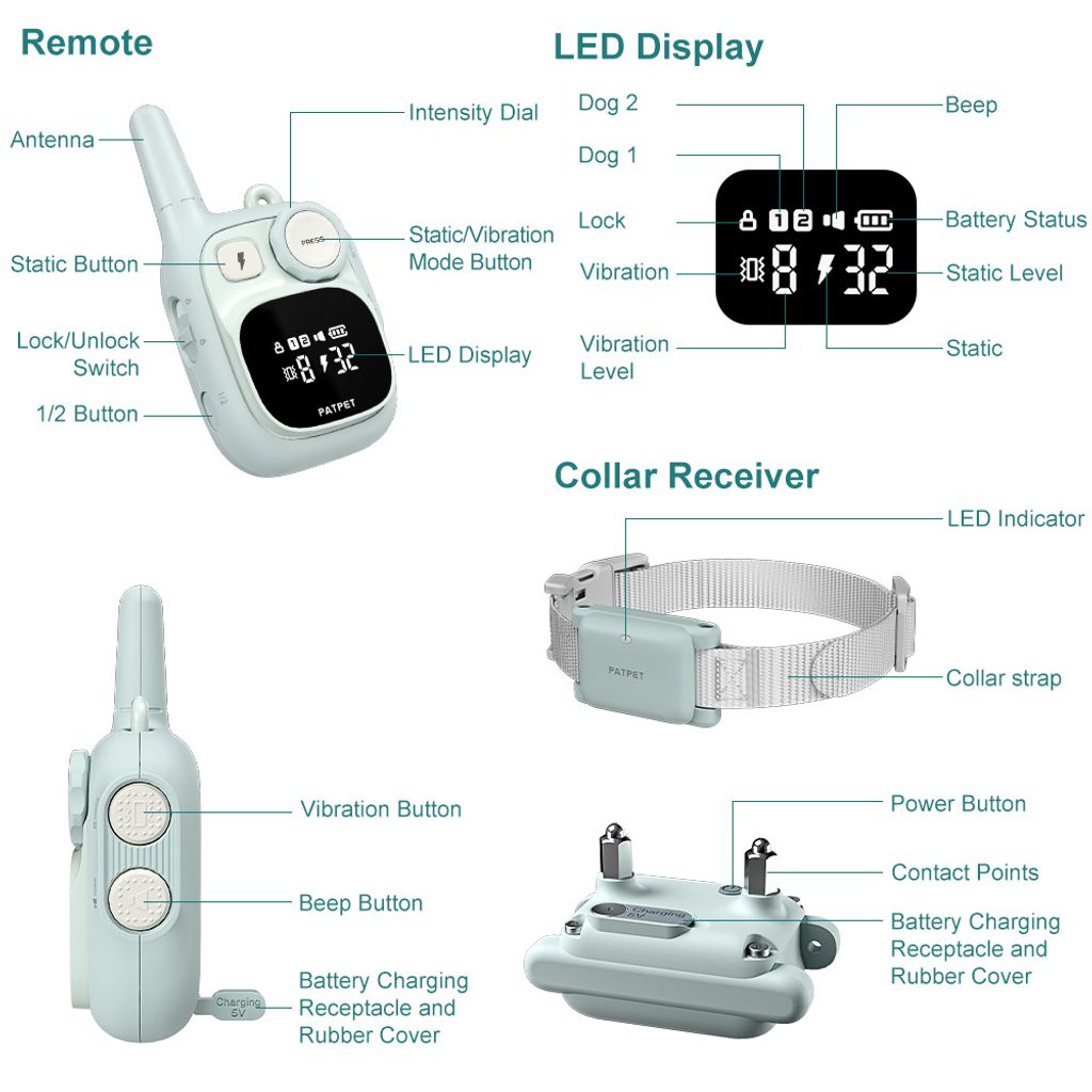 Das Patpet 628 Trainingshalsband bietet 3 Arten der Korrektur, Sie können den Hund durch Vibration in 8 Stufen und durch Impuls in 32 Stufen lenken, der Tonmodus hat 1 Stufe. Die Intensität kann leicht erhöht oder verringert werden, indem Sie die Taste auf dem Sender verwenden, um das Halsband an die Bedürfnisse Ihres Hundes anzupassen.