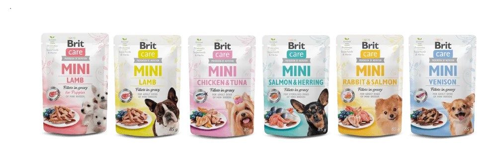 Brit Care Mini ist ein Fleischbeutel mit Huhn und Thunfisch für ausgewachsene Hunde kleiner Rassen.