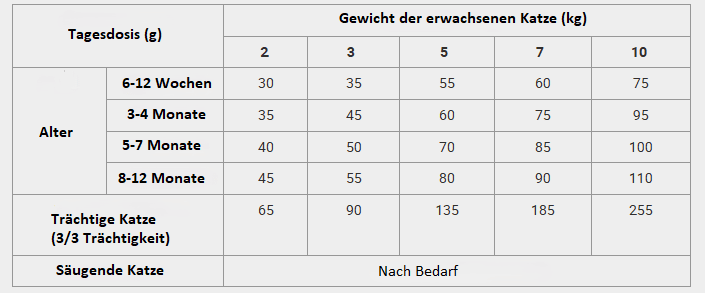 Rohprotein 40 %, Rohfett 19 %, Rohasche 7 %, Rohfaser 2 %, Calcium 1,25 %, Phosphor 0,85 %, Natrium 0,45 %, Magnesium 0,09 %, Omega-6-Fettsäuren 3,9 %, Omega-3-Fettsäuren 0,4 %, Feuchtigkeit 7 %.