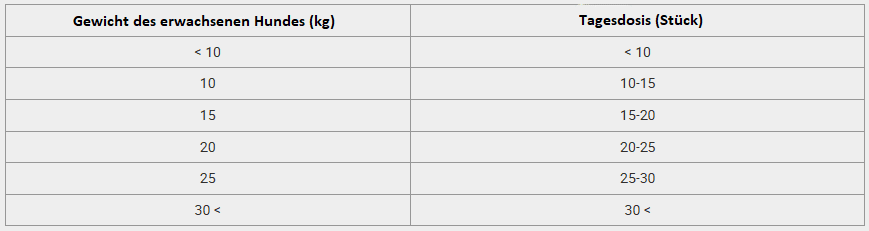 Fütterungshinweis: Als Belohnung für positive Motivation während des Trainings verwenden. Dieses Produkt ist kein Ersatz für eine vollwertige Ernährung. Bitte sorgen Sie dafür, dass Ihrem Hund stets frisches Wasser zur Verfügung steht. Die empfohlene Dosierung ist in der Futtertabelle angegeben.